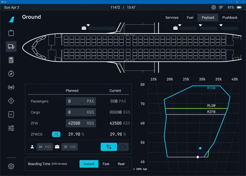 The Payload page allows setting up the payload of the aircraft, board and deboard passengers and load cargo.
