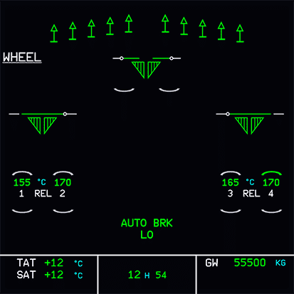 The upper ECAM should now show the engines in reverse mode (REV) and the lower ECAM shows the Speed Brakes (spoiler) deployed. Also, you should notice that the brakes actually get hotter.