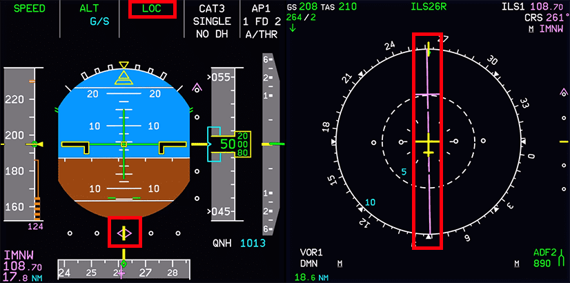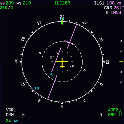 ROSE LS Modefor theND(can also be on F.O.'s side). The ROSE LS Mode shows the deviation from the localizer approach heading path. -