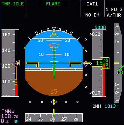 At about 30ft, we start our flare by pulling back on the sidestick carefully. We only need a few degrees in positive pitch and hold the aircraft there. Too much flare will cause the aircraft to float down the runway, too little will cause a harder landing.