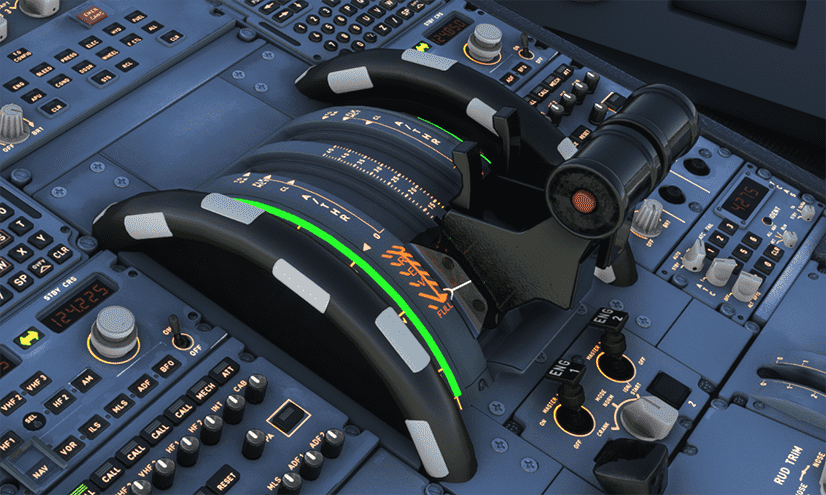 On touchdown of the main gear, the Speed Brakes will deploy automatically (we have armed them earlier) and we pull the thrust levers into the reverse position.