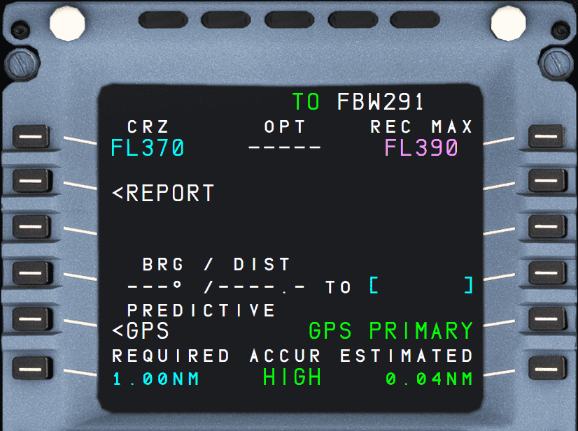 GPS PRIMARY is displayed when the FMS navigation mode is GPS PRIMARY. When GPS PRIMARY is not available, or navigation mode is not GPS/IRS, this field is blank.