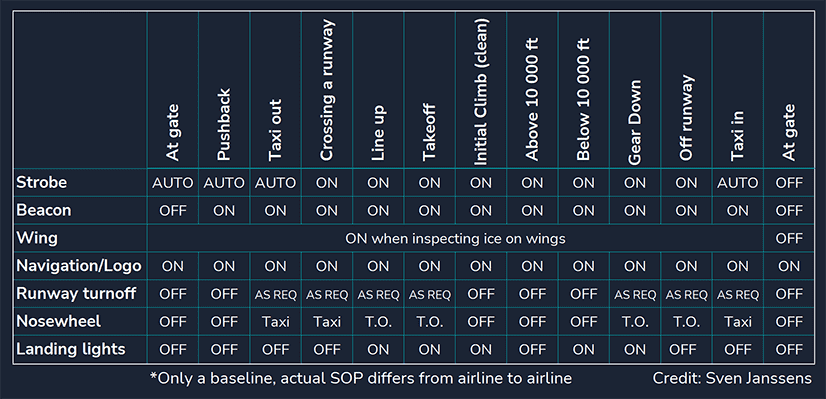 • Turns on both taxi and takeoff lights.